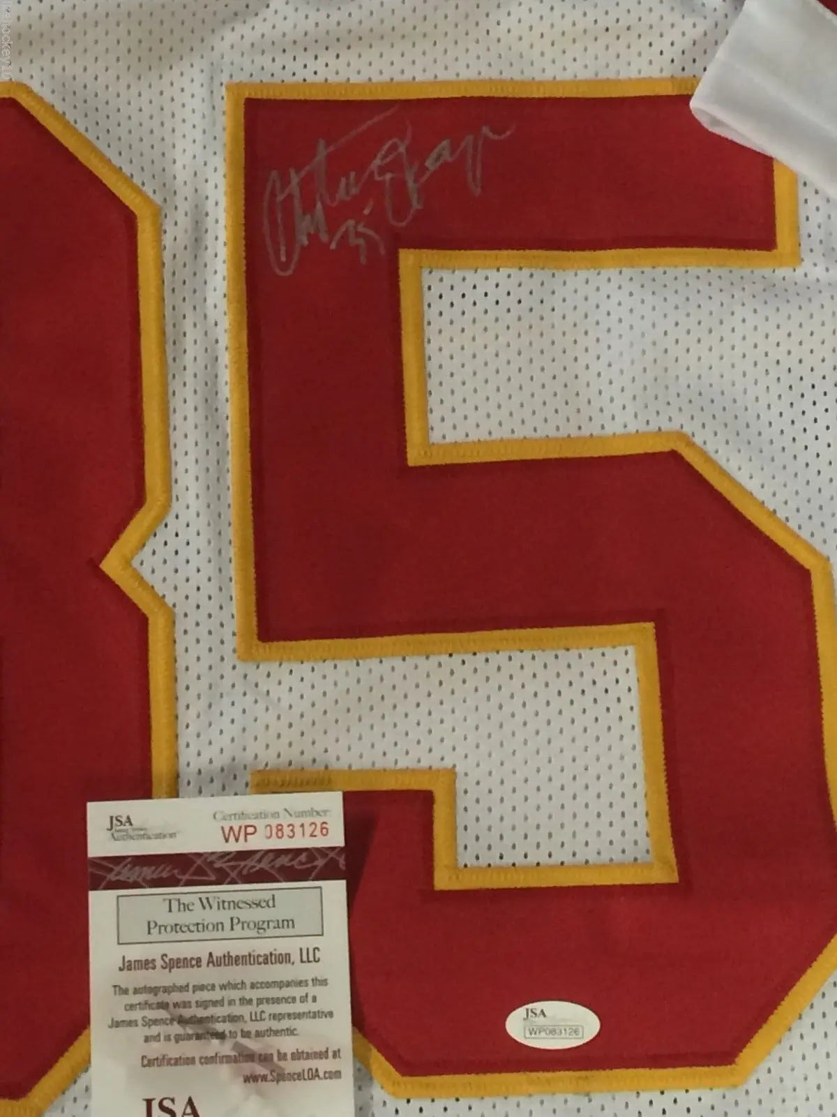 The authentication is from JSA. This signature is not authenticated by opinion but it is WITNESSED by a representative of JSA! 100% AUTHENTIC!!! The jersey has fully stitched numbers on the front and back. No tags or logos. This is not an official NFL jersey but it is very high quality. It is a great item and a must for all great sports fans!