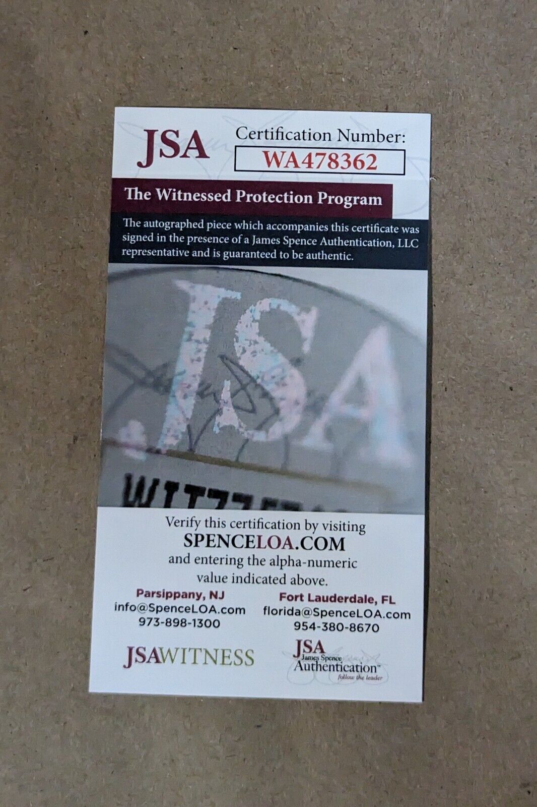 The authentication is from JSA. This signature is authenticated by a representative of JSA! 100% AUTHENTIC!!! The jersey has fully stitched numbers on the front and back. It is a great item and a must for all great sports fans!
