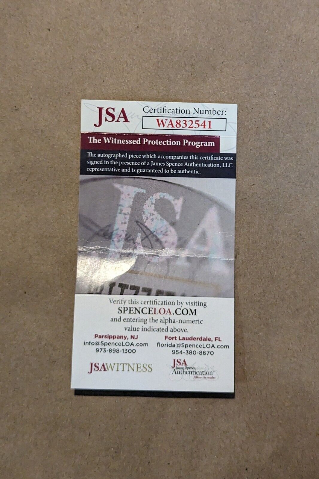 The authentication is from JSA. This signature is authenticated by a representative of JSA! 100% AUTHENTIC!!! The jersey has fully stitched numbers on the front and back. No tags or logos. This is not an official NFL jersey but it is very high quality. It is a great item and a must for all great sports fans!
