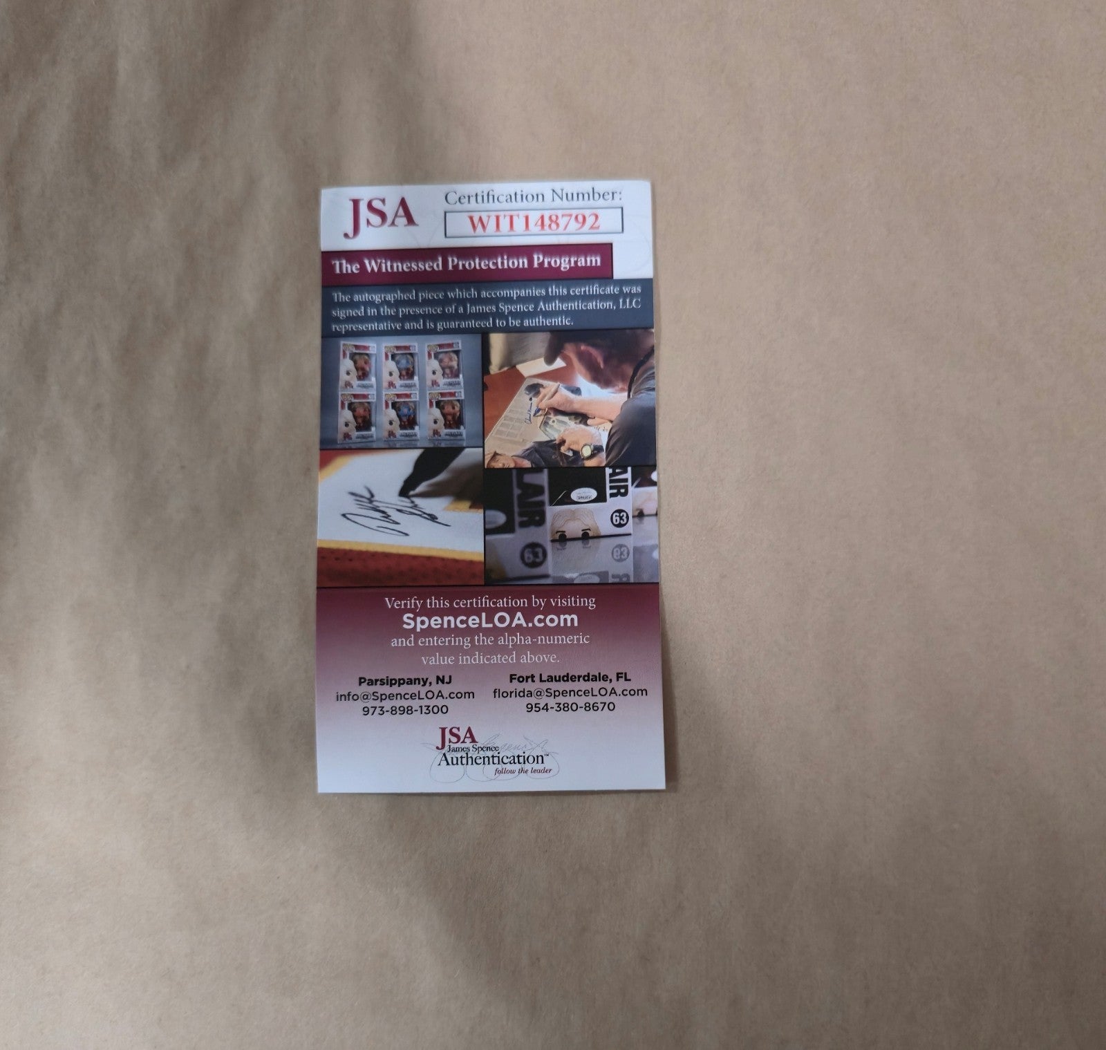The authentication is from JSA. 100% AUTHENTIC!!! The jersey has fully stitched numbers on the front and back. It is a great item and a must for all great sports fans!