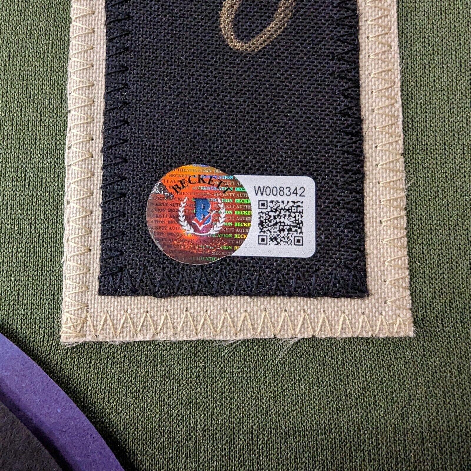 This item is professionally framed, it measures 32”x40” inside , 42”x34” outside , using UV protective Acrylic glass for safe keeping and safe transport, team color SUEDE matting, black moulding and hanging hooks on the back. All additional items in frame seen in pictures included. 100% ready to hang in your fan cave.