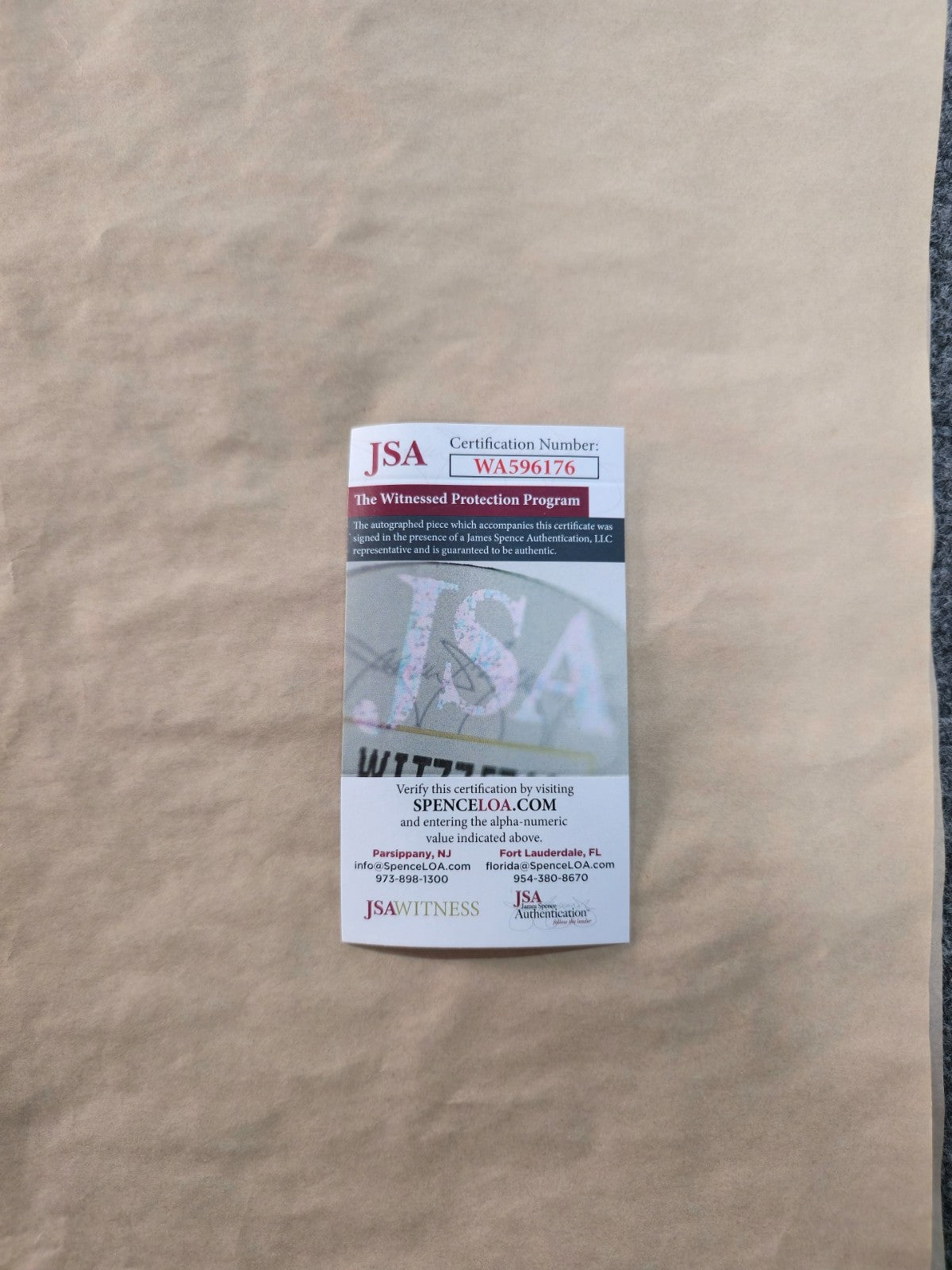 The authentication is from JSA. 100% AUTHENTIC!!! The jersey has fully stitched numbers on the front and back. It is a great item and a must for all great sports fans!
