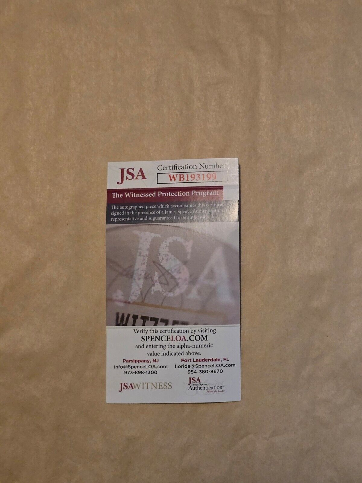 The authentication is from JSA. This signature is WITNESSED by a representative of JSA! 100% AUTHENTIC!!! The jersey has fully stitched numbers on the front and back. It is a great item and a must for all great sports fans!