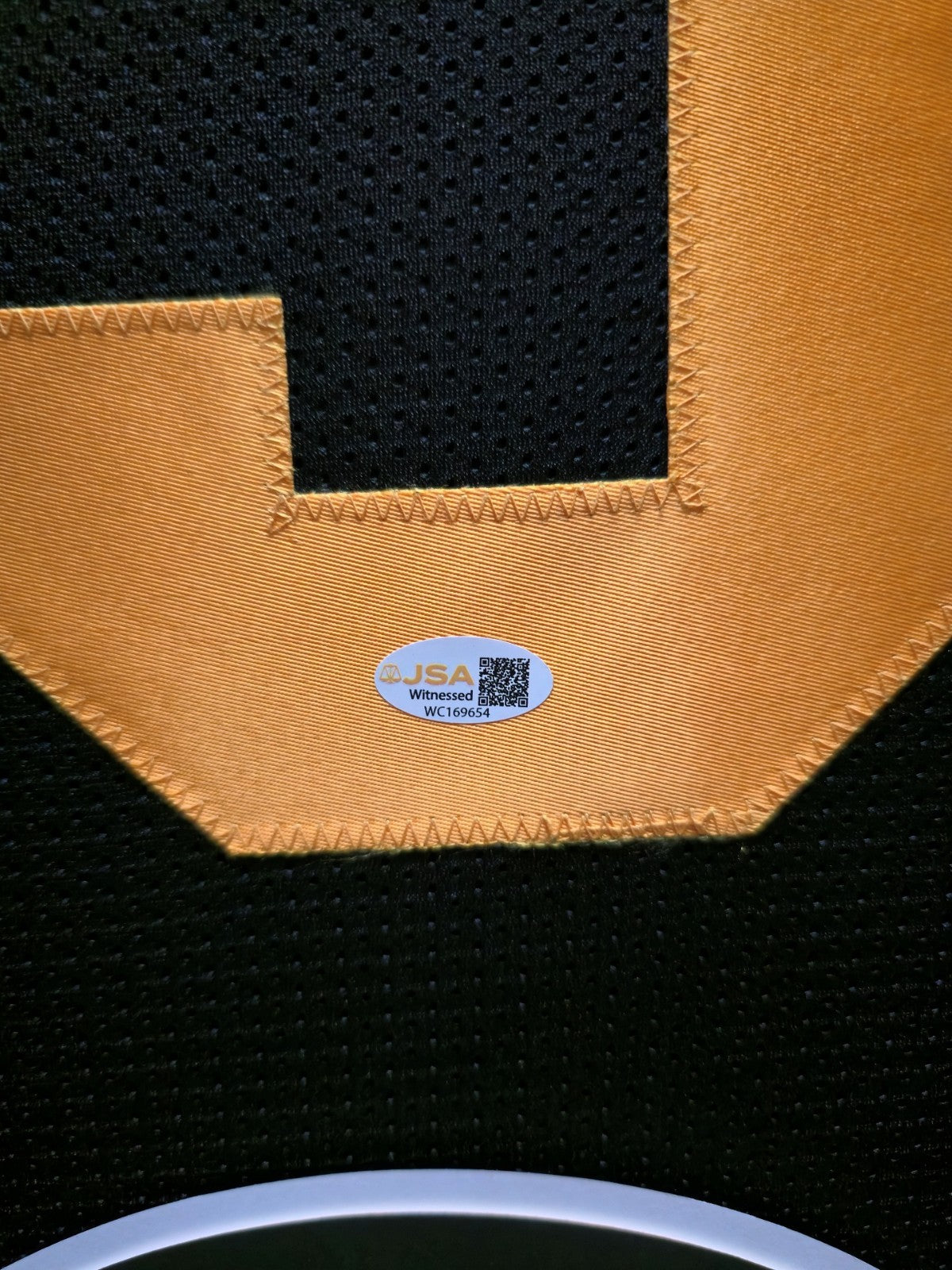 The authentication is from JSA. This signature is WITNESSED by a representative of JSA! 100% AUTHENTIC!!! The jersey has fully stitched numbers on the front and back. It is a great item and a must for all great sports fans!