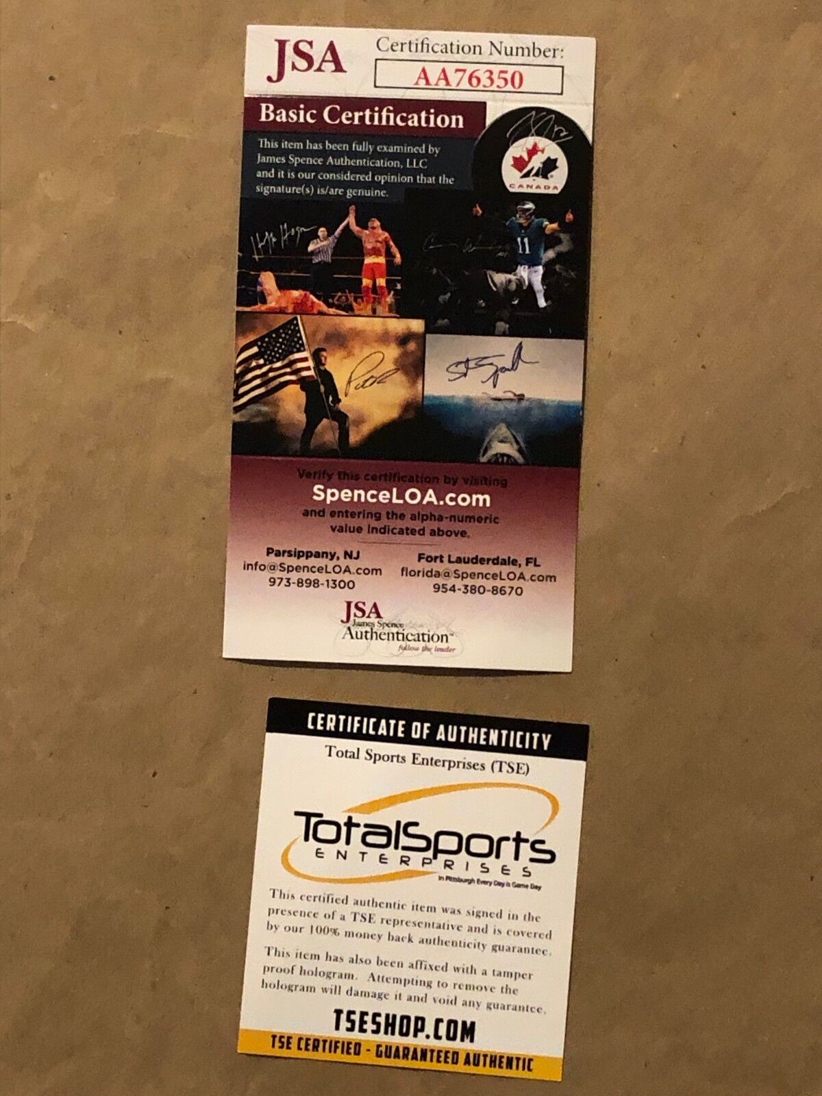 The authentication is from JSA. This signature is not authenticated by opinion but it is WITNESSED by a representative of JSA! 100% AUTHENTIC!!! The jersey has fully stitched numbers on the front and back. It is a great item and a must for all great sports fans!