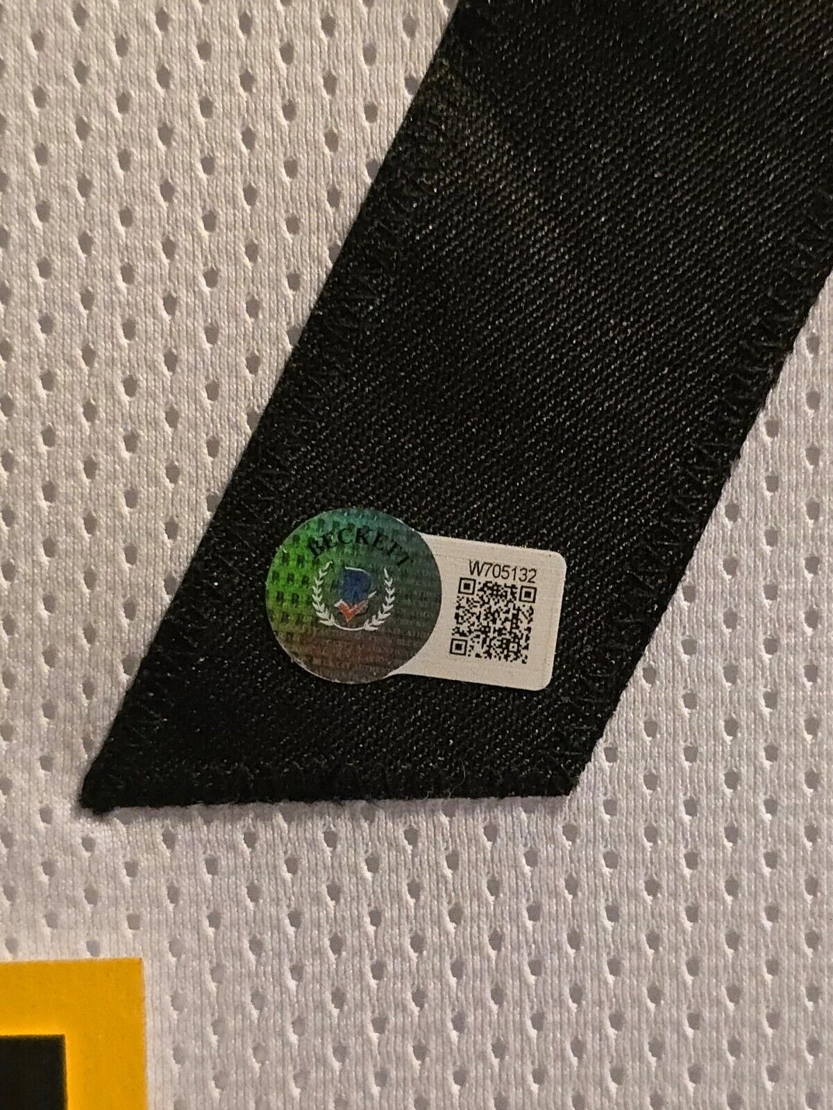 The authentication is from Beckett. This signature is WITNESSED by a representative of Beckett! 100% AUTHENTIC!!! The jersey has fully stitched numbers on the front and back. It is a great item and a must for all great sports fans!