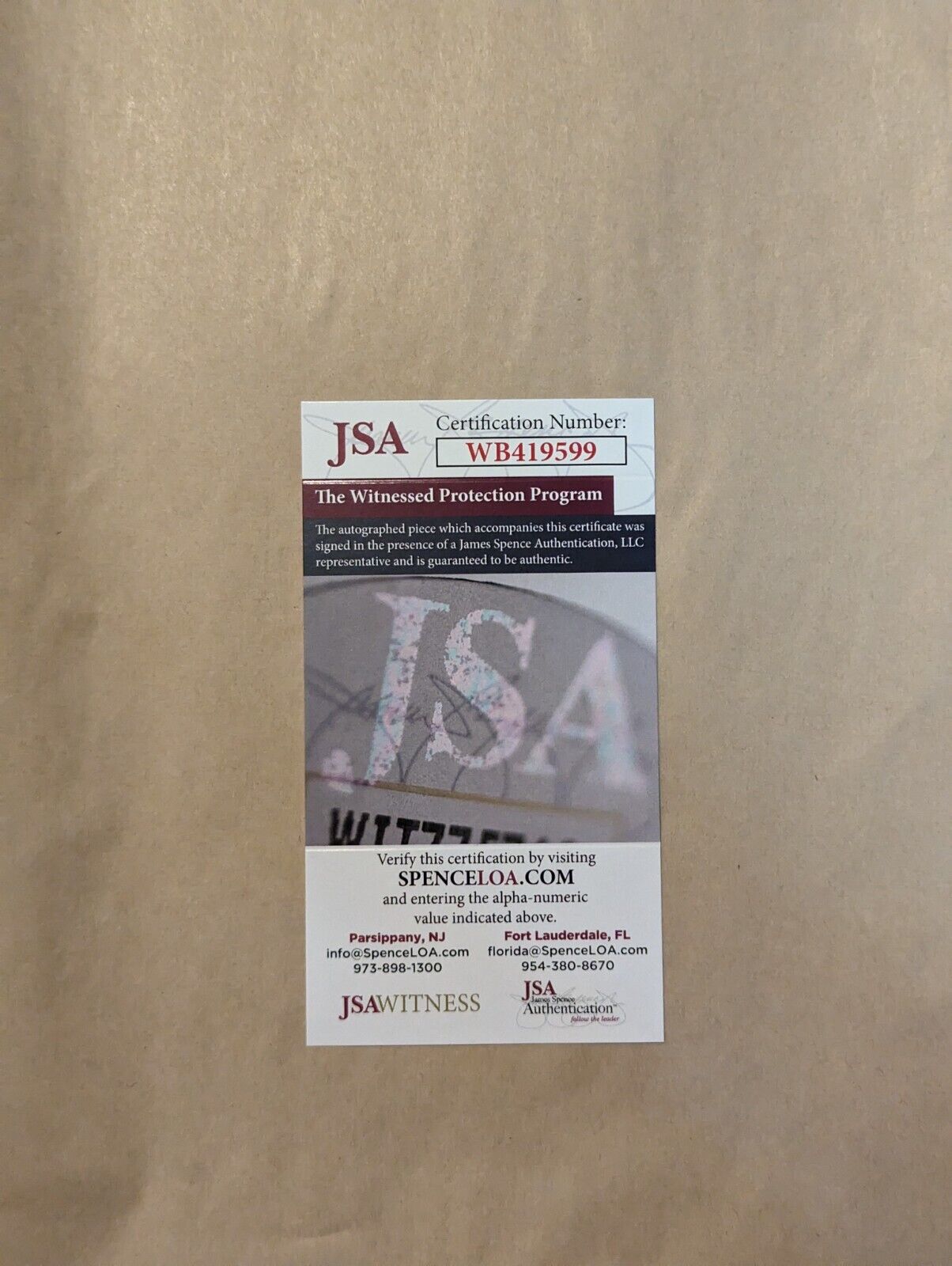The authentication is from JSA. This signature is WITNESSED by a representative of JSA! 100% AUTHENTIC!!!   The jersey has fully stitched numbers on the front and back.  It is a great item and a must for all great sports fans!
