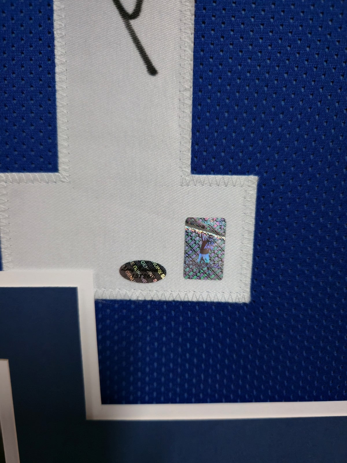 This item is professionally framed, it measures 32”x40” inside , 42”x34” outside , using UV protective Acrylic glass for safe keeping and safe transport, SUEDE team color matting, black moulding and hanging hooks on the back. All additional items in frame seen in pictures included. 100% ready to hang in your fan cave.