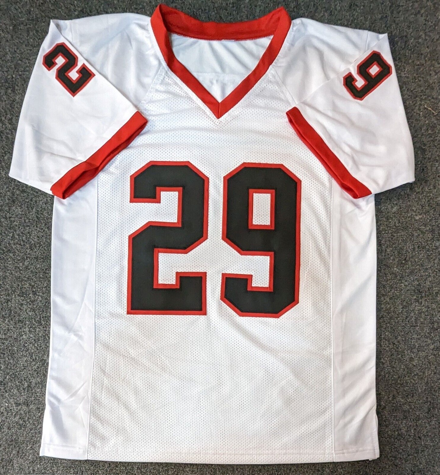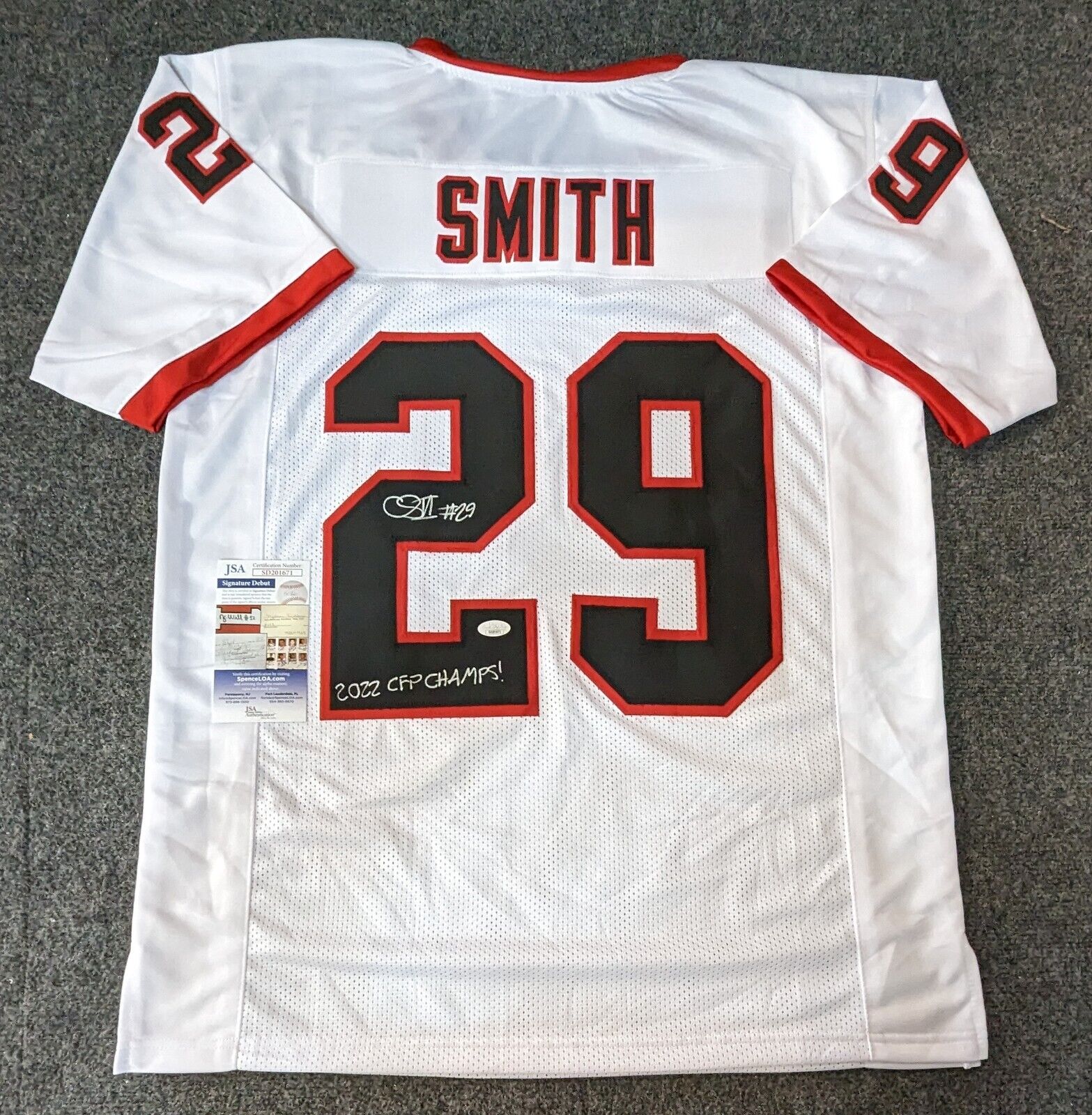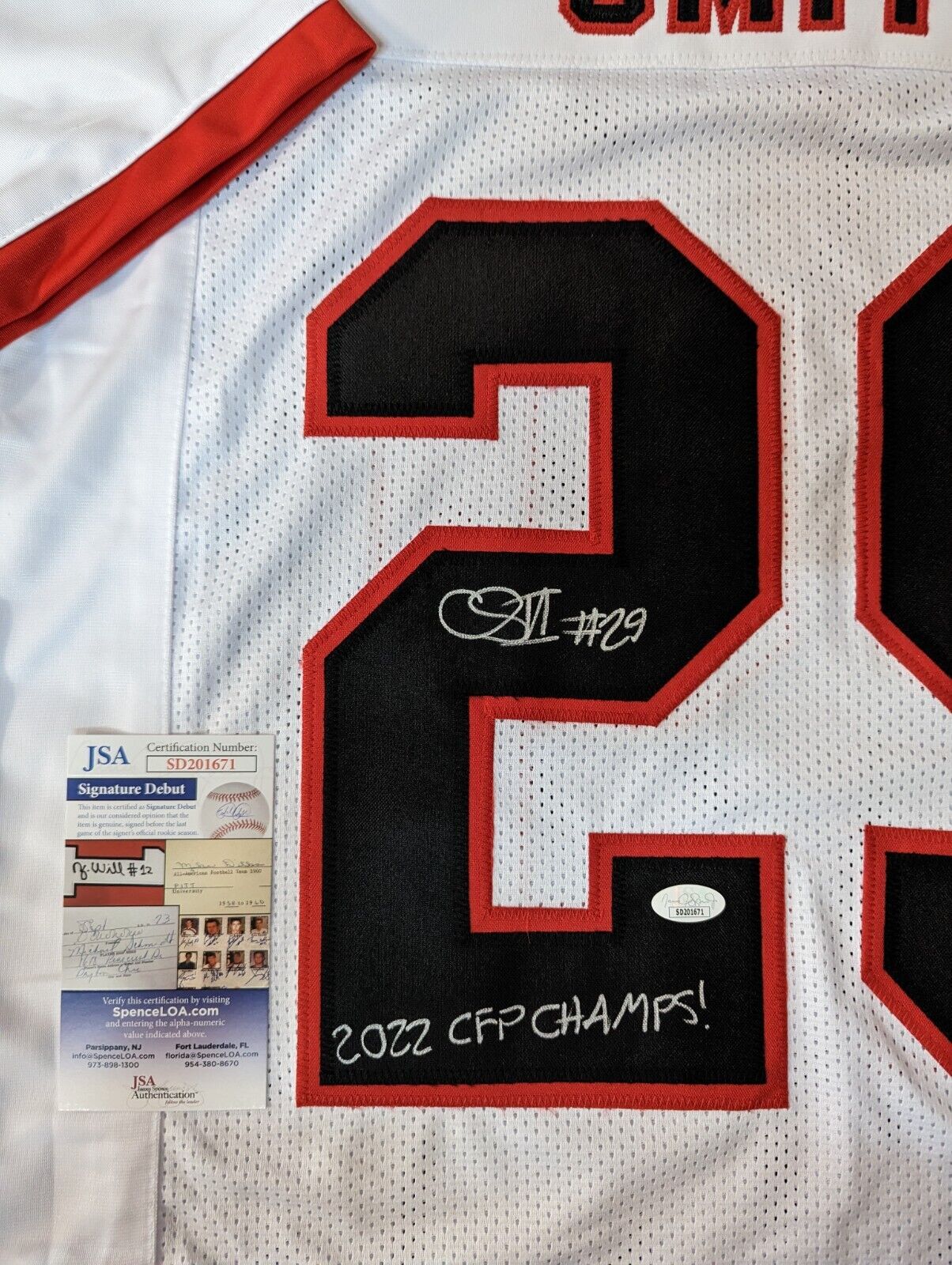 The authentication is from JSA. This signature is authenticated by being WITNESSED by a representative of JSA! 100% AUTHENTIC!!! The jersey has fully stitched numbers on the front and back. No tags or logos. This is not an official NCAA jersey but it is very high quality. It is a great item and a must for all great sports fans!