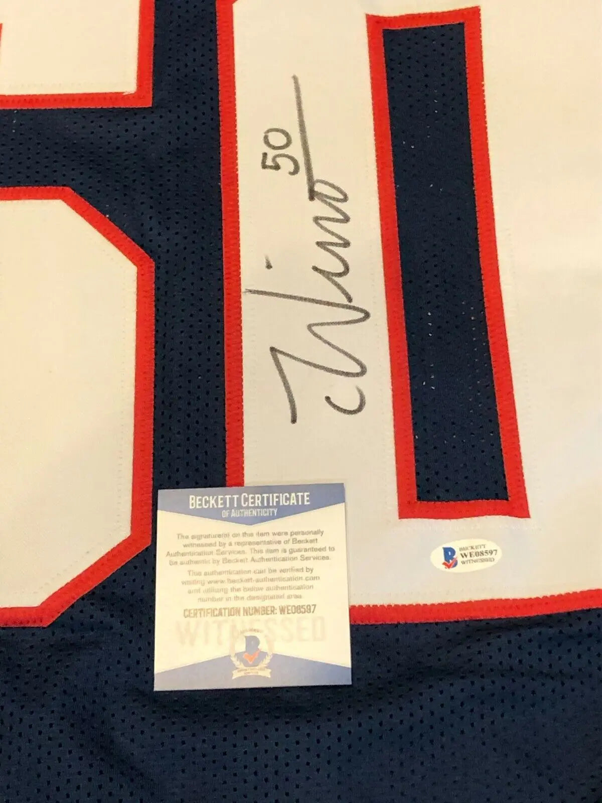 The authentication is from BAS. This signature is authenticated by a representative of BAS! 100% AUTHENTIC!!! The jersey has fully stitched numbers on the front and back. No tags or logos. This is not an official NFL jersey but it is very high quality. It is a great item and a must for all great sports fans!